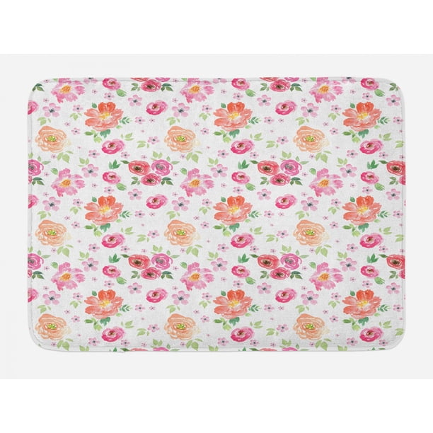 Pale Pink Bath Mat, Watercolor Style Rural Meadow Floral ...